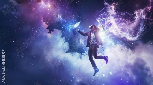 A man using virtual reality in a surreal universe with glowing effects