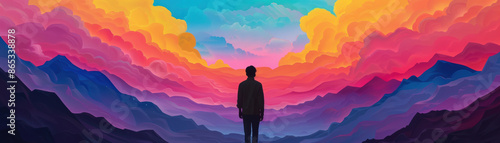 A man walking through a painting into a surreal world, feeling adventurous and curious, vibrant art gallery