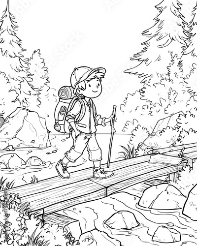 A man walks across a bridge over a river coloring page.