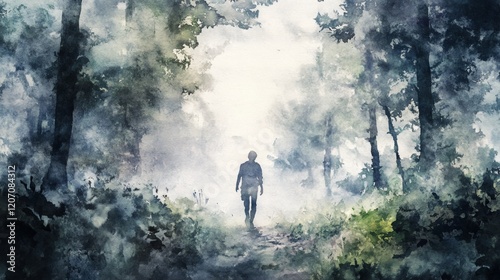 A man walks through a forest with trees in the background