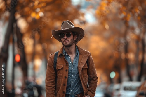 A man wearing a cowboy hat walks down a city street, perfect for travel or western-themed illustrations