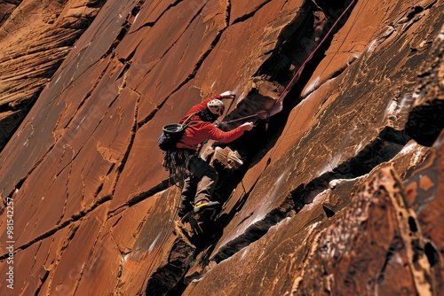 A man wearing a hard hat is intricately working on a piece of art, The intricate patterns of the rocks surface are highlighted by the climbers nimble fingers seeking purchase