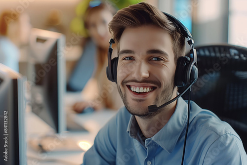 A man wearing a headset and smiling at the camera. He is sitting in front of a laptop