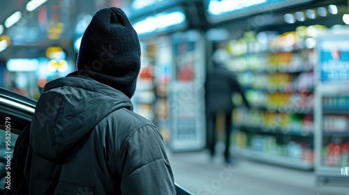 A man wearing a hoodie observes a store aisle at night, creating a mysterious and possibly suspicious atmosphere.