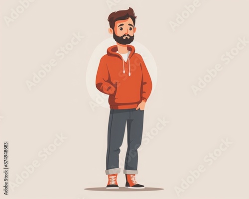 A man wearing a red hoodie and blue jeans. He has a beard and his hands are in his pockets.