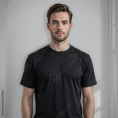 A man wearing a simple black t-shirt, showcasing minimalist style, comfortable fit, and versatile.
