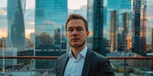 A man wearing a suit stands in front of a cityscape, ready for business or a meeting