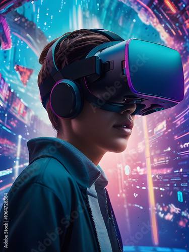 A man wearing a VR headset , virtual reality headset