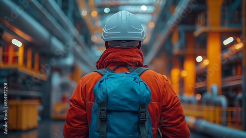 A man wearing a white helmet and a blue backpack is standing in a large, empty room. a flaw detector in a bright blue jacket and a white helmet stands with his back to full height
