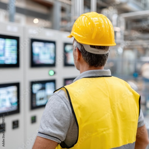 A man wearing a yellow hard hat and safety vest observes a control panel with multiple screens in an industrial setting.