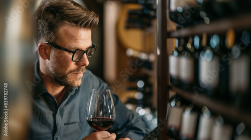 A man wearing glasses and a blue shirt smells a glass of red wine in a wine cellar.