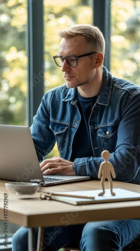 A man wearing glasses is sitting at a desk with a laptop