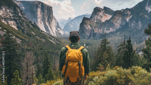 A man with a backpack standing and looking at the mountains in a scenic landscape.