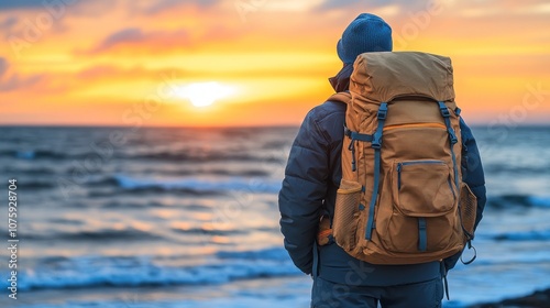 A man with a backpack stands on the beach, gazing at the sunrise over the ocean.