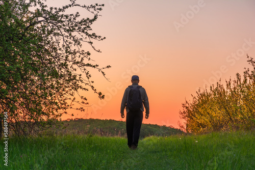 A man with a backpack walks along a path between bushes and trees. Evening summer landscape in sunset colors