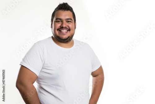 A man with a beard and a white shirt is smiling. He is posing for a picture. Concept of happiness and confidence