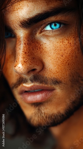 A man with a beard and blue eyes. The man has a blue eye shadow on his eye