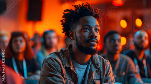 A Man with a Beard and Dreadlocks Watches a Performance in a Crowded Auditorium, Surrounded by Other Audience Members in a Warm, Intimate Setting.