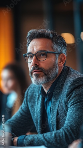 A man with a beard and glasses, dressed in business attire, leading a meeting in a modern conference room with colleagues.