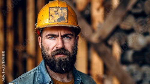 A man with a beard is depicted wearing a hard hat, indicating he is likely a skilled construction worker