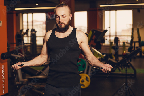 A man with a beard of an athletic build prepared to jump and do an exercise with a skipping rope