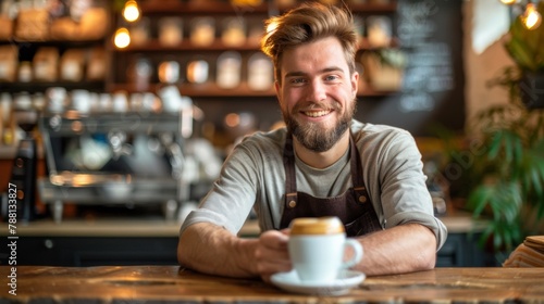 A man with a beard sitting at the counter of a coffee shop, AI