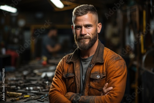 A man with a beard standing in a workshop. Digital image. Car mechanic or manual worker portrait.