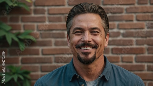 A man with a confident smile stands in front of a brick wall adorned with green plants in a sunny outdoor setting
