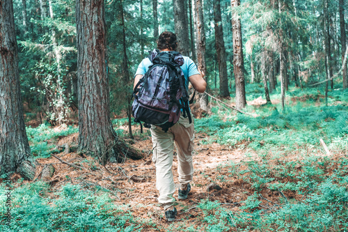 A man with a large tourist backpack traveling through the woods, ecotourism concept.