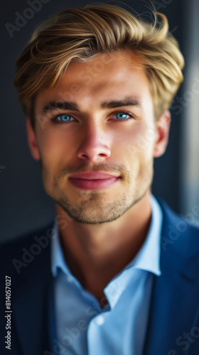 A man with blonde hair and blue eyes.