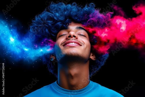 A man with blue hair and a blue shirt is smiling with his eyes closed