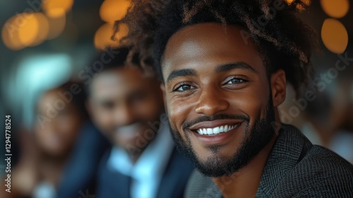 A man with curly hair smiles warmly while sitting at a table surrounded by friends in a vibrant social setting during the evening. The atmosphere is cheerful and inviting
