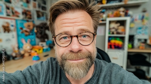 A man with glasses and a beard is smiling at the camera. The room he is in is filled with stuffed animals and toys, giving it a playful and cozy atmosphere