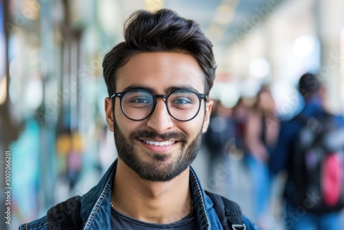 A man with glasses is smiling and wearing a blue jacket. He is surrounded by people, some of whom are carrying backpacks