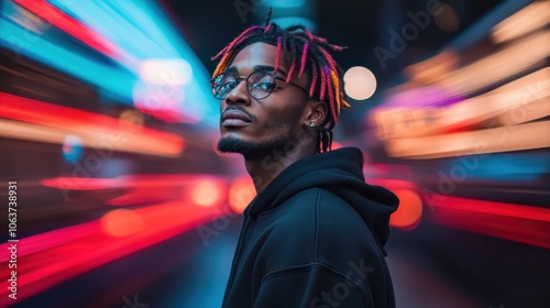 A man with glasses poses against a dynamic backdrop of vibrant light trails, symbolizing movement and modern life, conveying a sense of focus and determination.