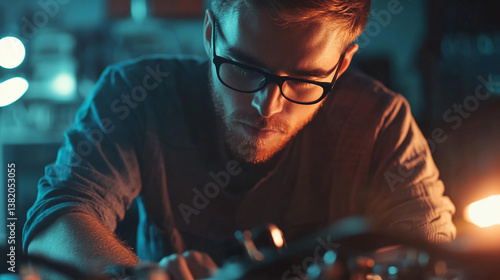 A man with glasses working on electronics with blue and orange lighting in a dark room setting
