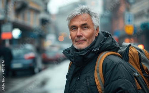 A man with gray hair, dressed in a black jacket, strolls down a bustling city street on a cloudy day, capturing the urban atmosphere