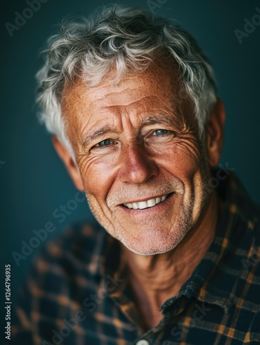 A man with grey hair and a beard, wearing a plaid shirt, stands against a blue wall.