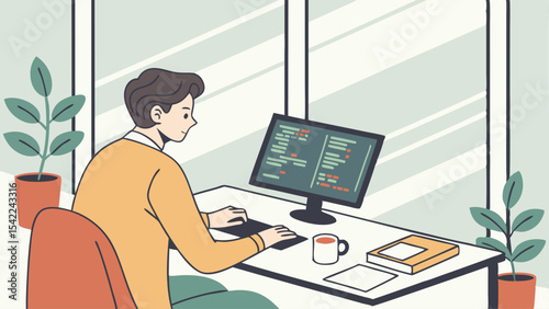 A man working at his desk with a computer monitor displaying code and plants by the window in the room