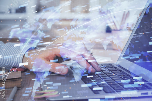 A man working on Laptop with technology theme drawing. Concept of big data. Double exposure.