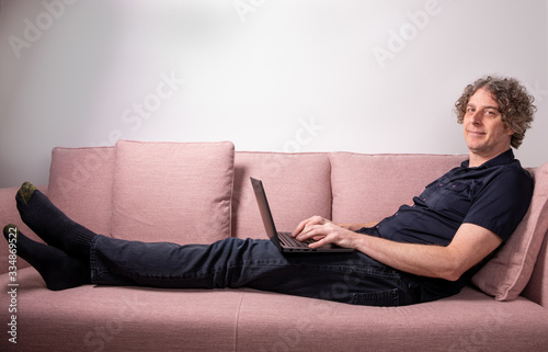 A man works from home on a laptop computer, sitting with feet up on a pink sofa. He looks at the camera while working.