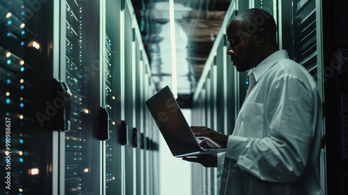 A man works intently on his laptop in a dimly lit server room, surrounded by blinking hardware, symbolizing dedication to data management and cybersecurity.