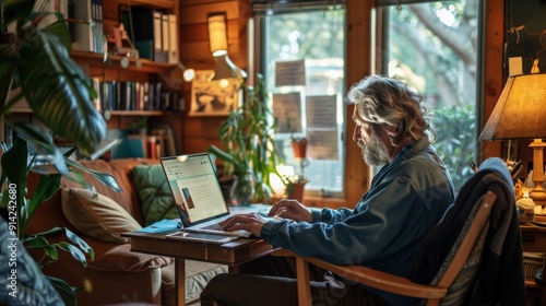 A man works on a laptop in a cozy cabin setting, surrounded by books and plants. Sunlight streams through the window.