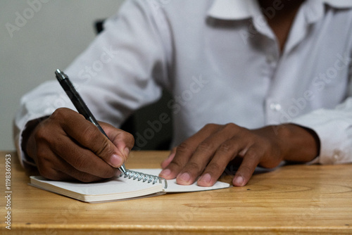 A man writing in a spiral notebook with a pen on a wooden desk, Concept of planning, productivity, and remote work. Perfect for illustrating business, education.