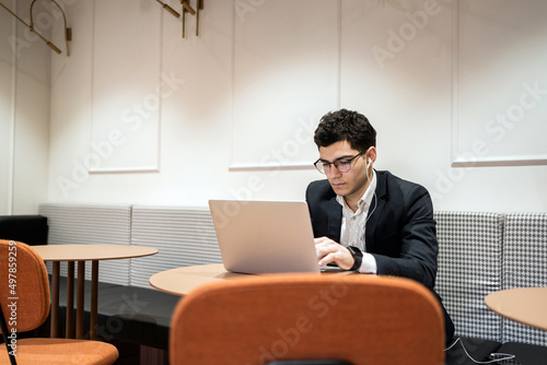 A manager with glasses, a man in informal clothes, works in an office in a coworking, uses a laptop computer