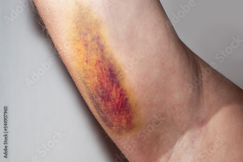 A man's arm with a large colored bruise on the skin on the inside of his shoulder. Medical concept