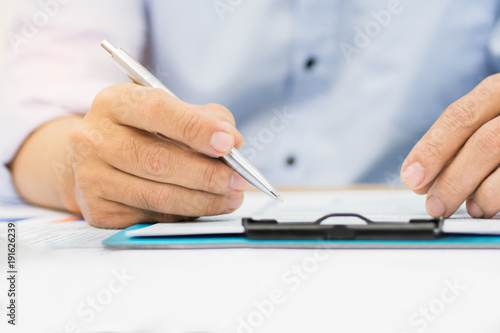 A man's hand holding pen pointing on summary report chart and calculate finance in office.