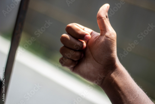 A man's hand pointing the thumb up and blur background