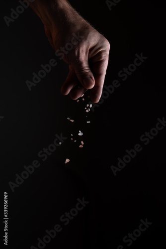 A man's hand scattering pink colour Himalaya salt on black background with strong light