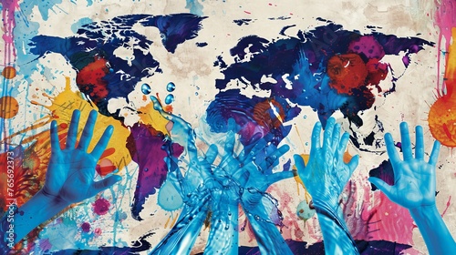 A map of the world with rivers highlighted in blue, flowing towards hands of different colors coming together in the center. Express the global nature of the water crisis